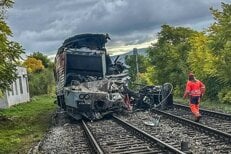 Jeden z vlakov vykoľajilo a trčí kolmo na trať.